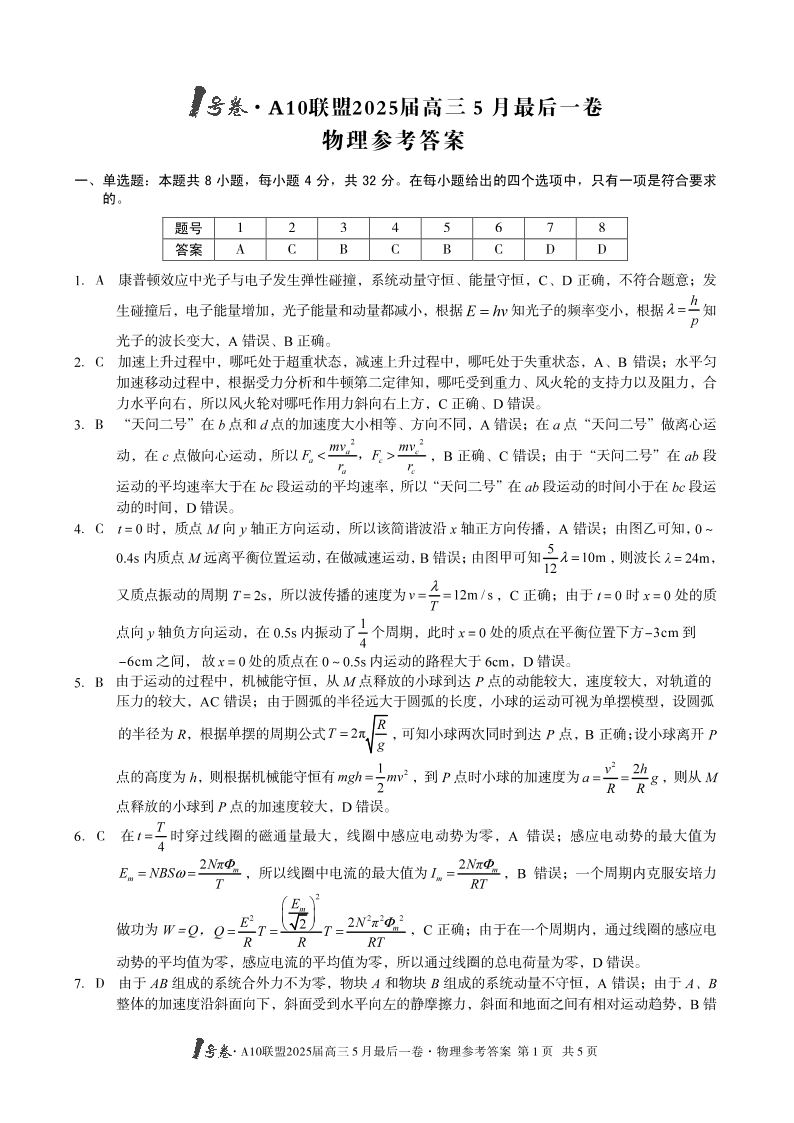 安徽省1号卷·A10联盟2025届高三5月最后一卷物理答案