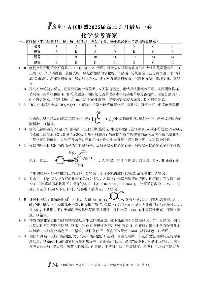 安徽省1号卷·A10联盟2025届高三5月最后一卷化学答案