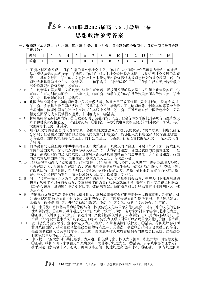 安徽省1号卷·A10联盟2025届高三5月最后一卷政治答案