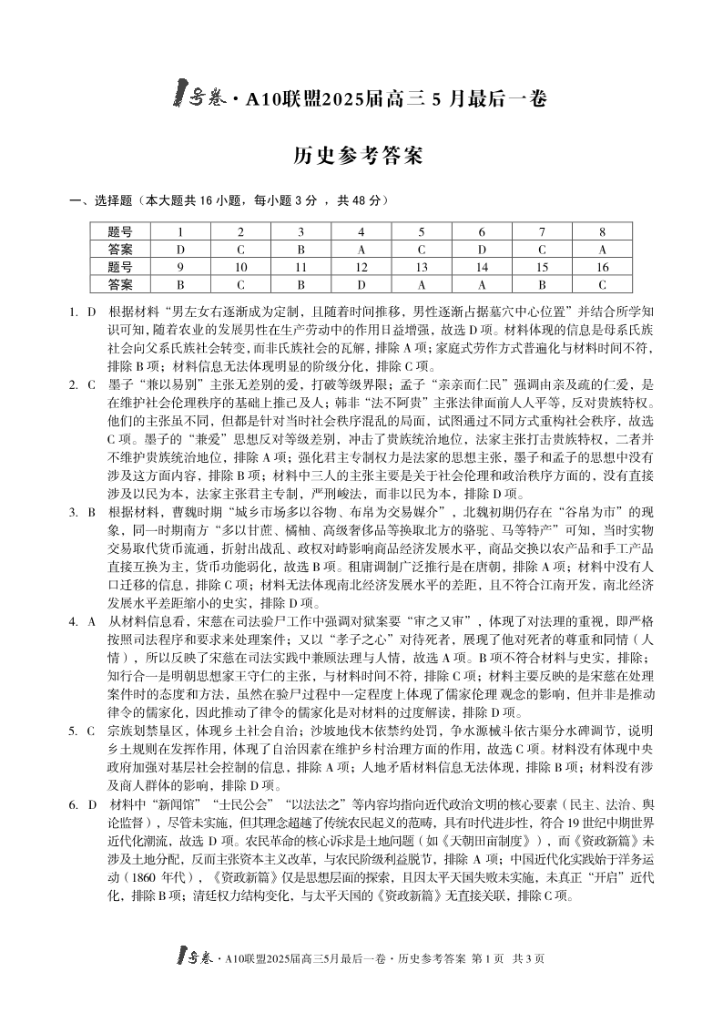 安徽省1号卷·A10联盟2025届高三5月最后一卷历史答案