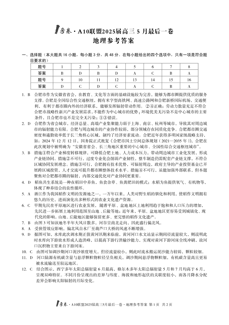 安徽省1号卷·A10联盟2025届高三5月最后一卷地理答案
