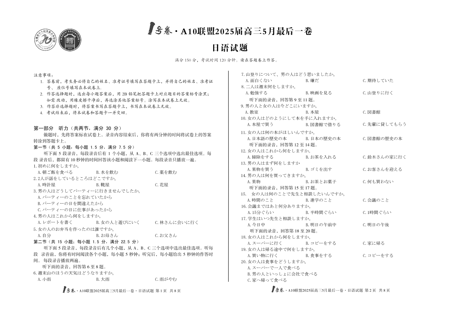 安徽省1号卷·A10联盟2025届高三5月最后一卷日语