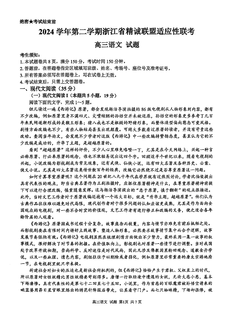 浙江省精诚联盟2025届高三下学期5月适应性联考语文
