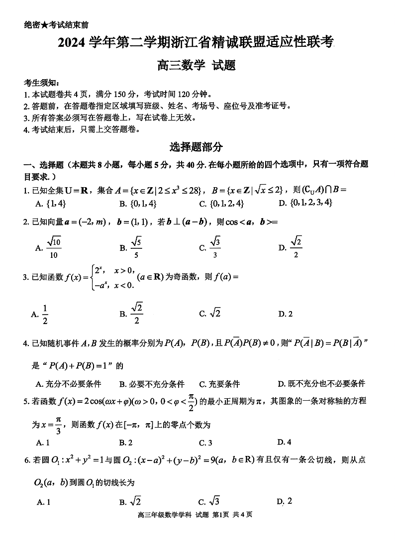 浙江省精诚联盟2025届高三下学期5月适应性联考数学
