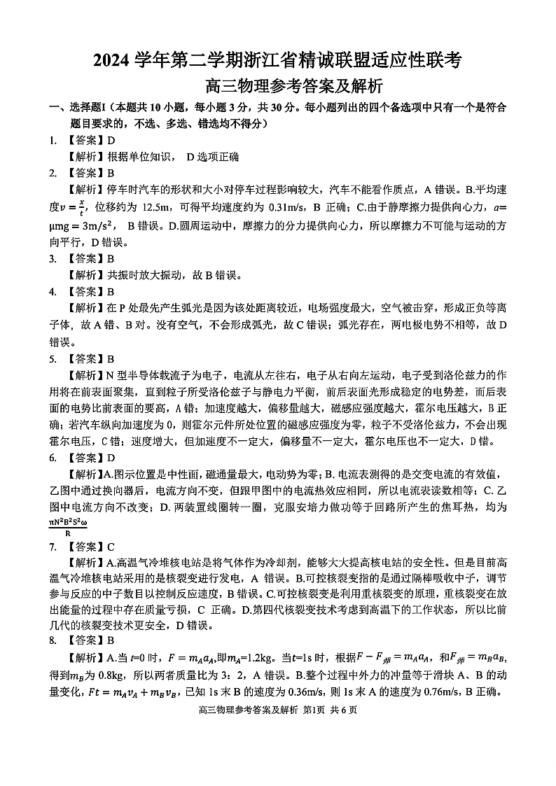 浙江省精诚联盟2025届高三下学期5月适应性联考物理答案