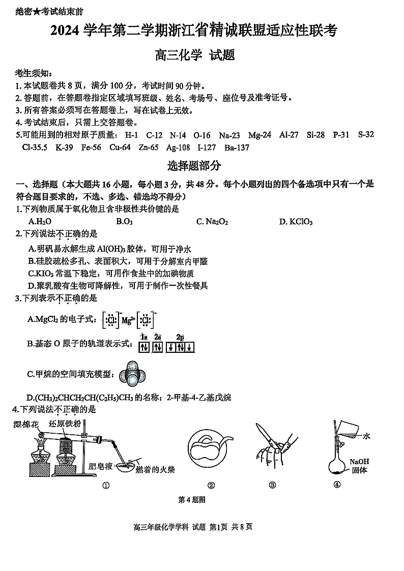 浙江省精诚联盟2025届高三下学期5月适应性联考化学