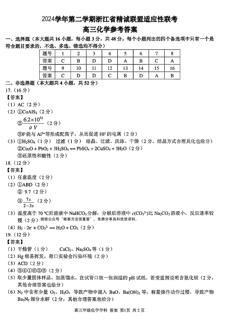 浙江省精诚联盟2025届高三下学期5月适应性联考化学答案