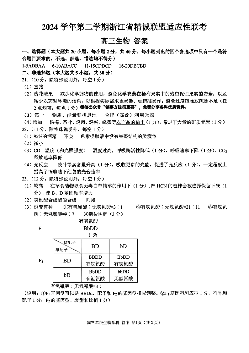 浙江省精诚联盟2025届高三下学期5月适应性联考生物答案
