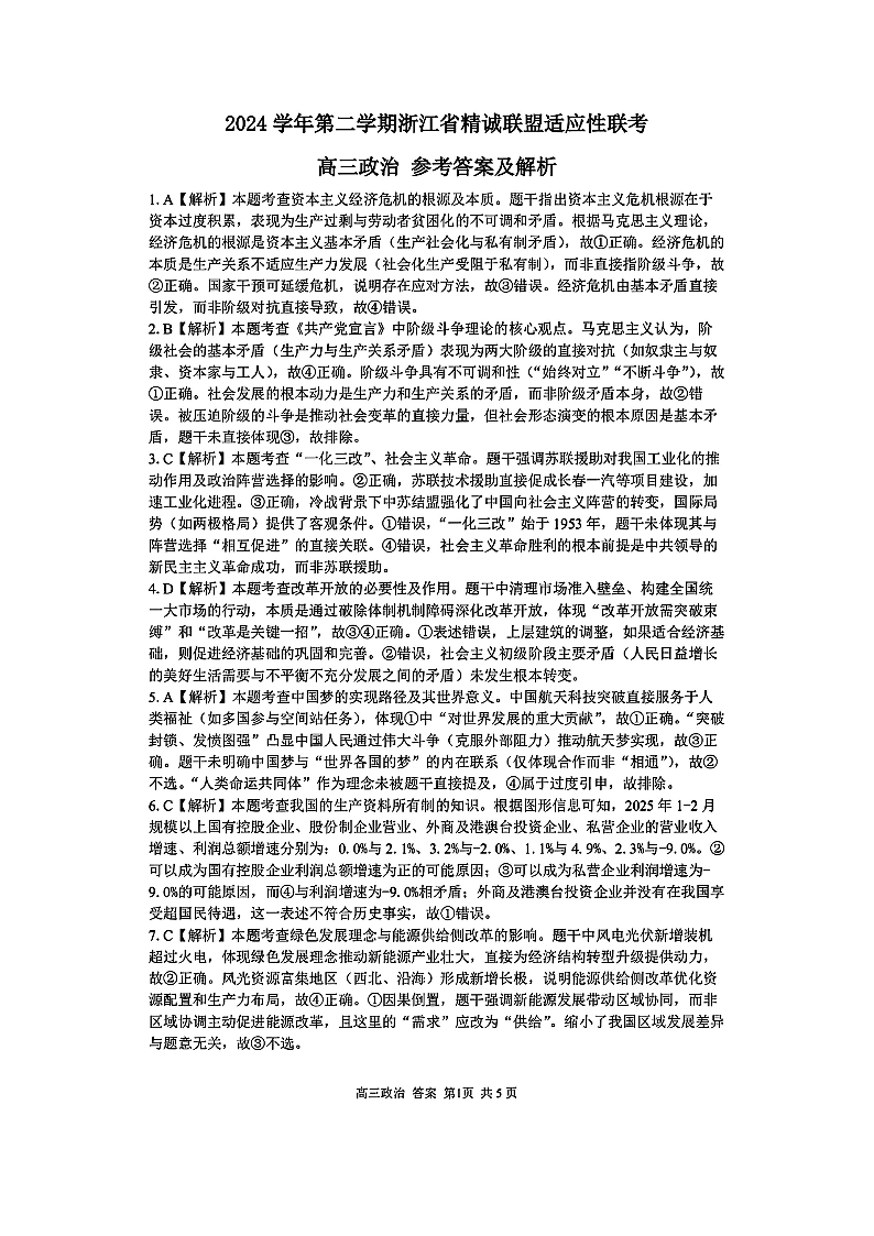 浙江省精诚联盟2025届高三下学期5月适应性联考政治答案