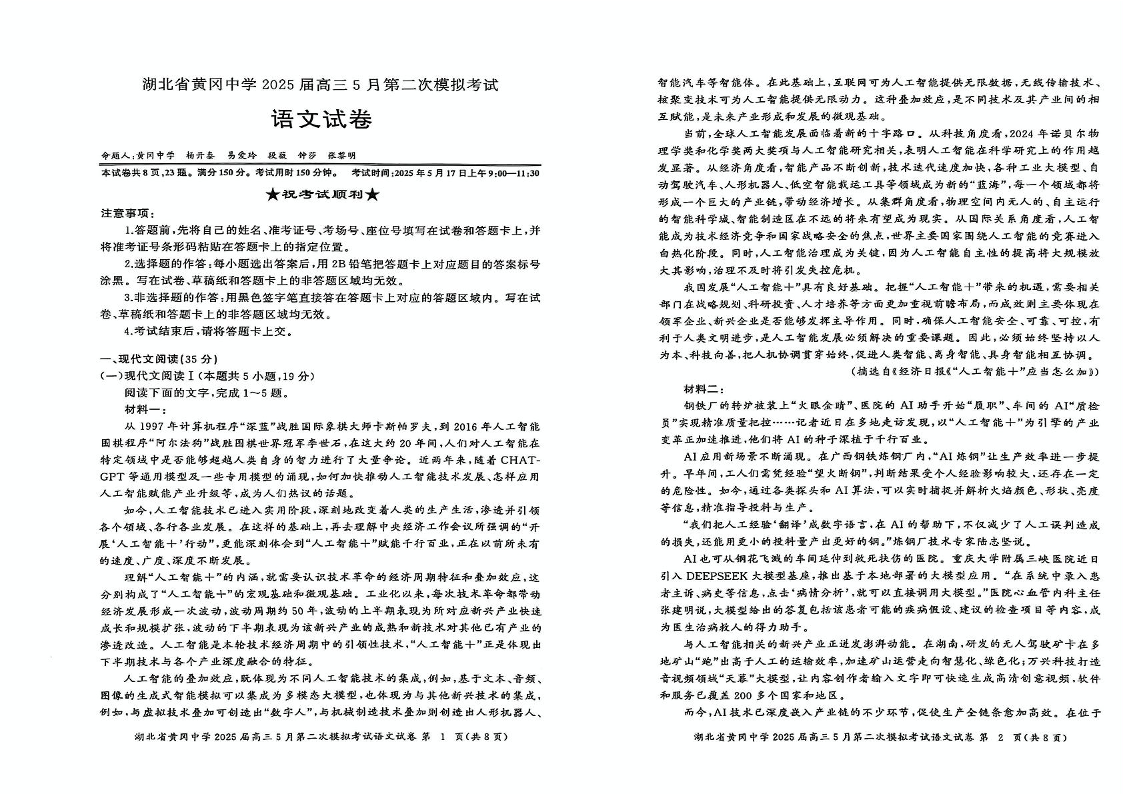湖北省黄冈中学2025届高三下学期5月第二次模模拟预测语文