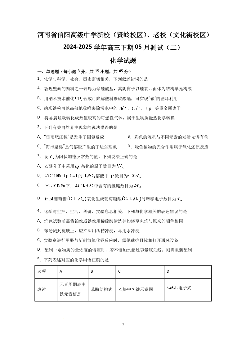 河南省信阳高级中学2025届高三下学期5月测试(二)化学