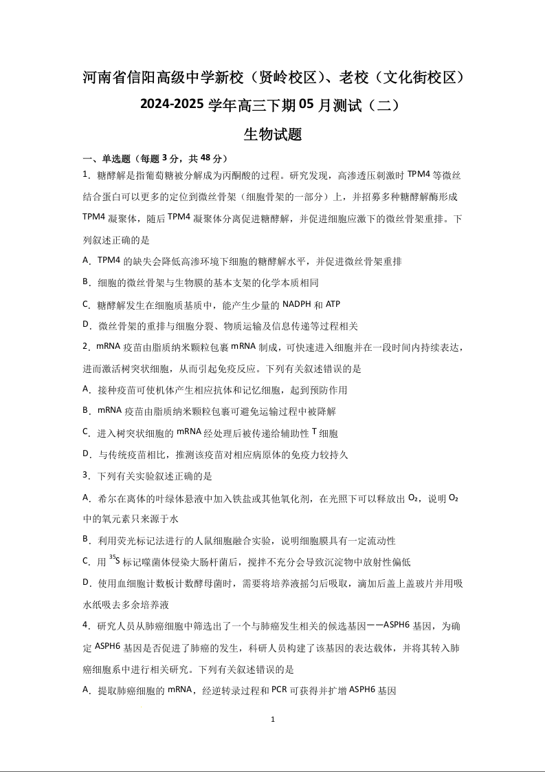 河南省信阳高级中学2025届高三下学期5月测试(二)生物