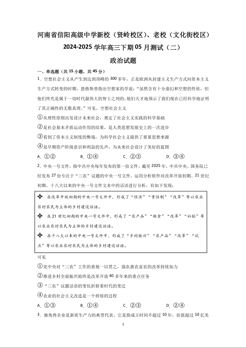 河南省信阳高级中学2025届高三下学期5月测试(二)政治