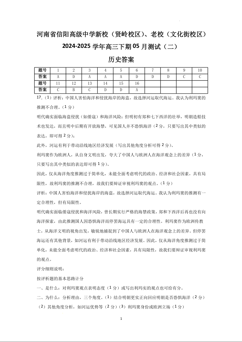 河南省信阳高级中学2025届高三下学期5月测试(二)历史答案