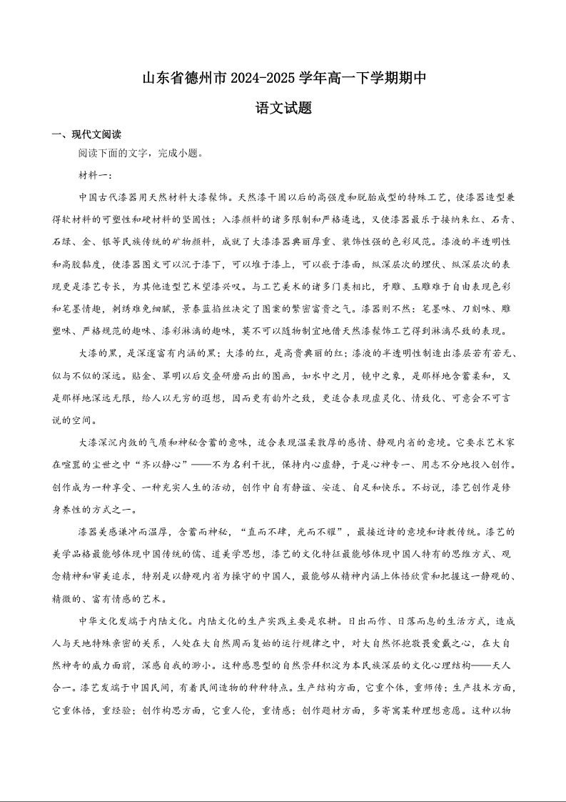 山东省德州市2024-2025学年下学期高一期中考试语文+答案