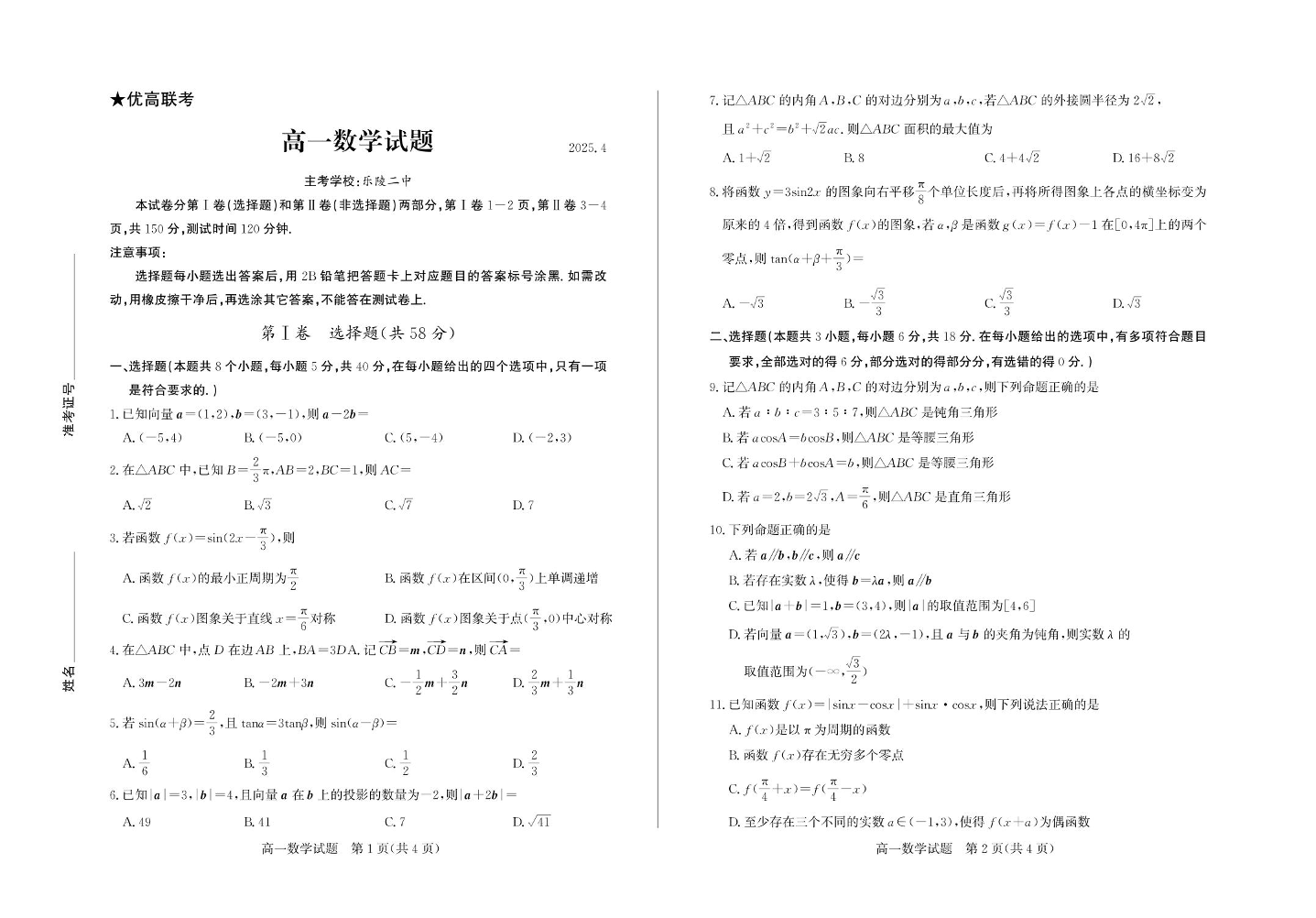 山东省德州市2024-2025学年下学期高一期中考试数学
