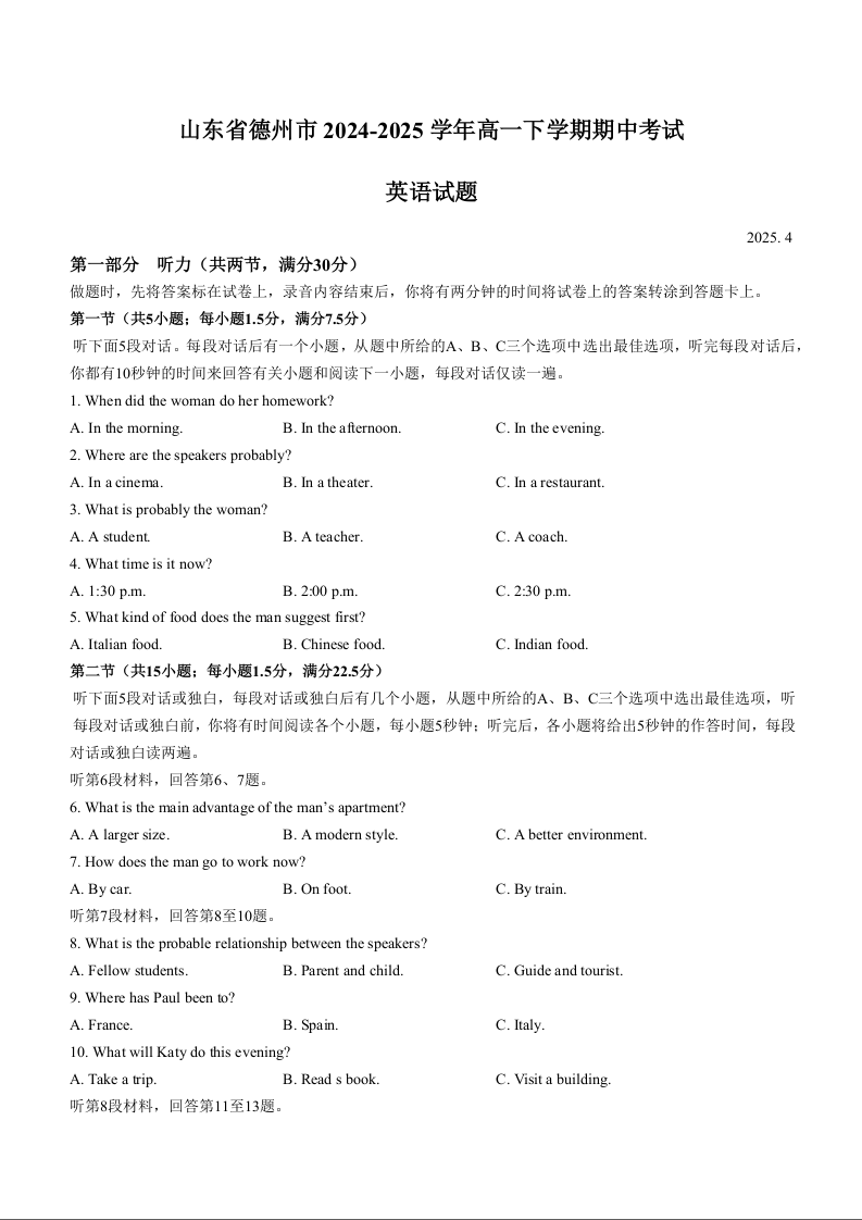 山东省德州市2024-2025学年下学期高一期中考试英语+答案