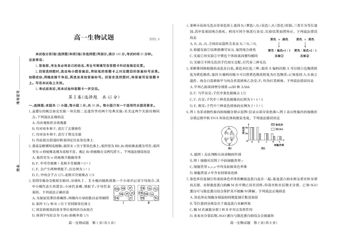 山东省德州市2024-2025学年下学期高一期中考试生物+答案