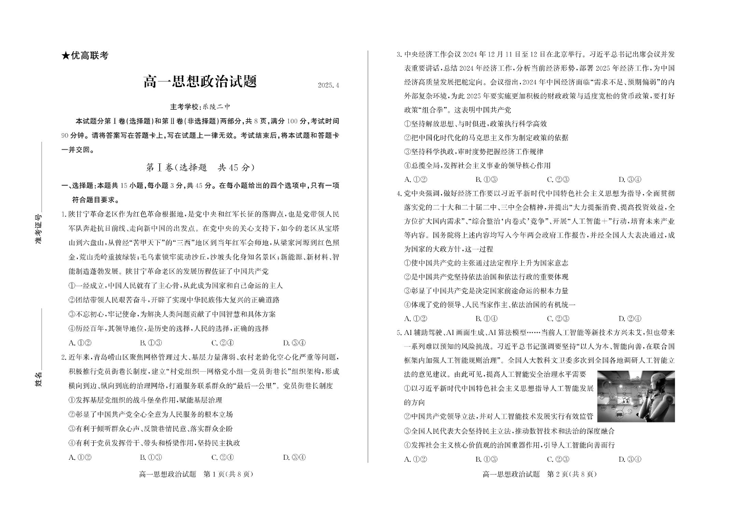 山东省德州市2024-2025学年下学期高一期中考试政治