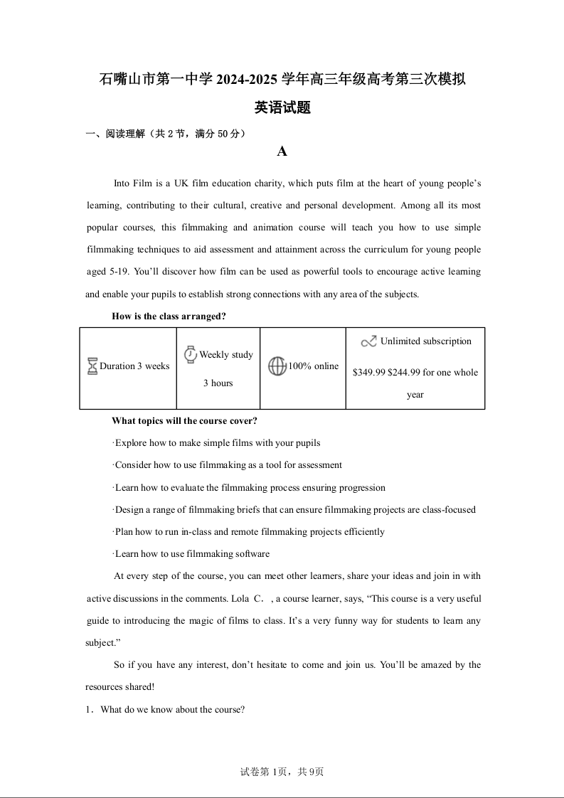 宁夏回族自治区石嘴山市一中2025届高三高考三模考试英语