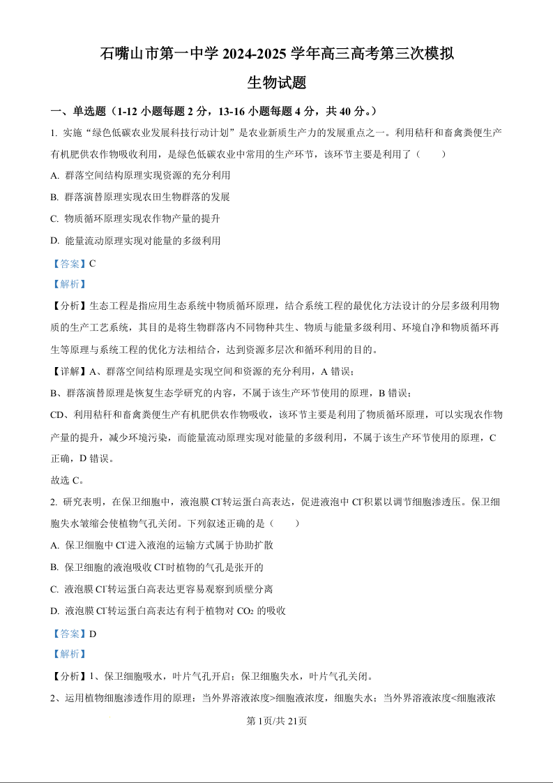 宁夏回族自治区石嘴山市一中2025届高三高考三模考试生物(精品解析版)