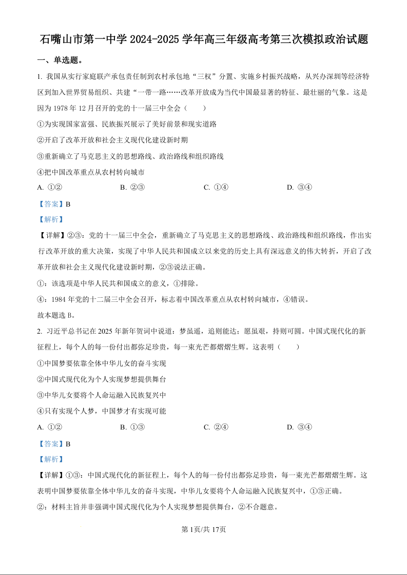 宁夏回族自治区石嘴山市一中2025届高三高考三模考试政治(精品解析版)