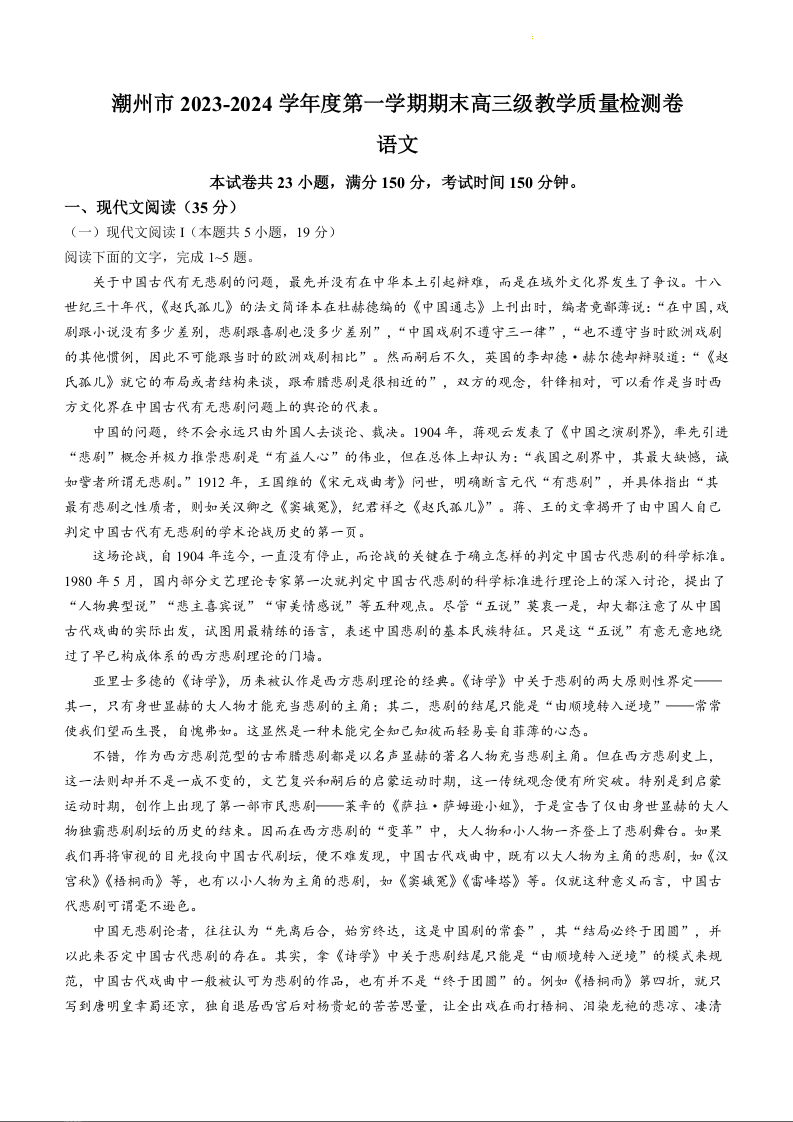 广东省潮州市2024届高三上学期期末考试语文+答案