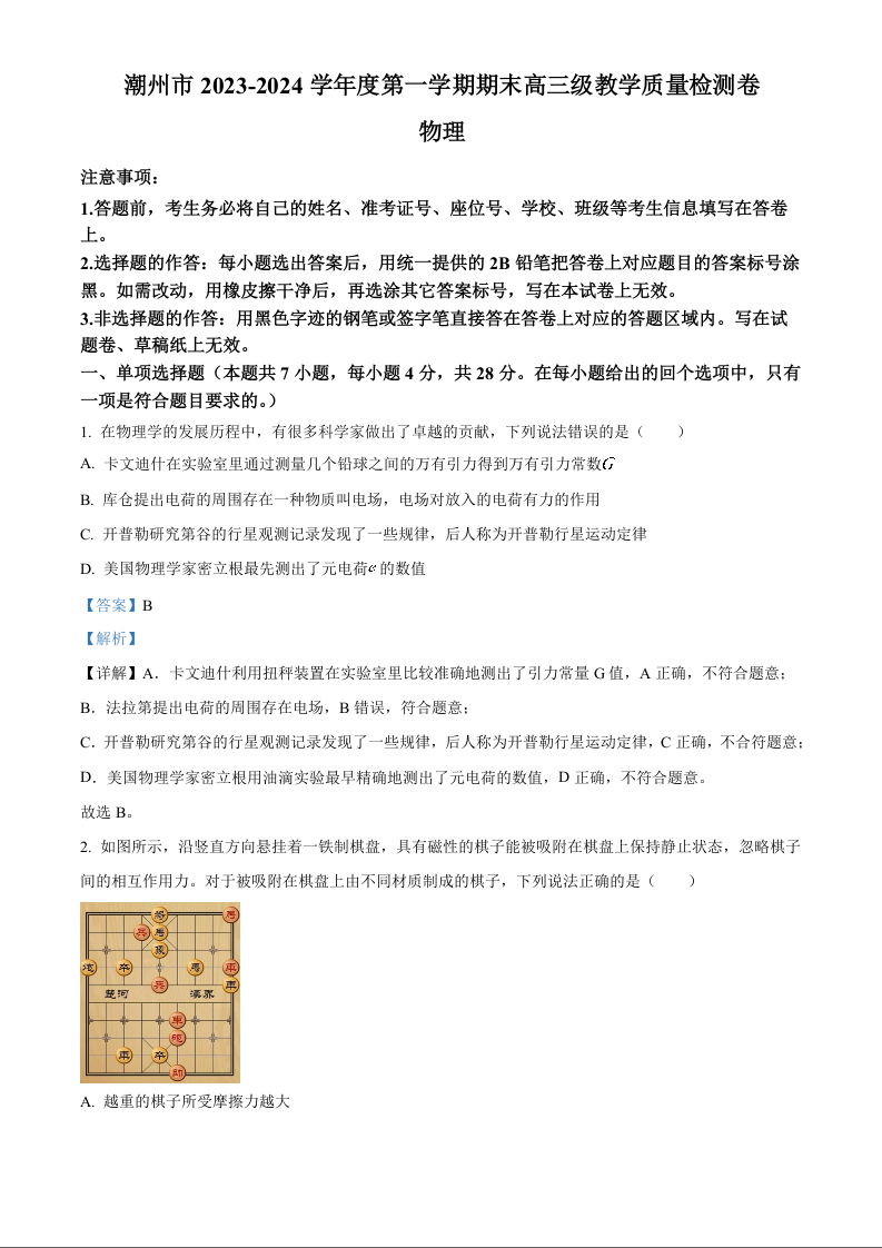 广东省潮州市2024届高三上学期期末考试物理(精品解析版)