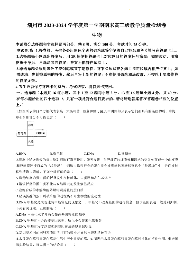 广东省潮州市2024届高三上学期期末考试生物+答案