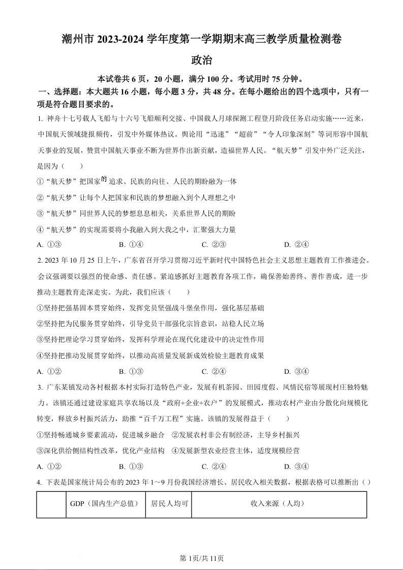 广东省潮州市2024届高三上学期期末考试政治+答案