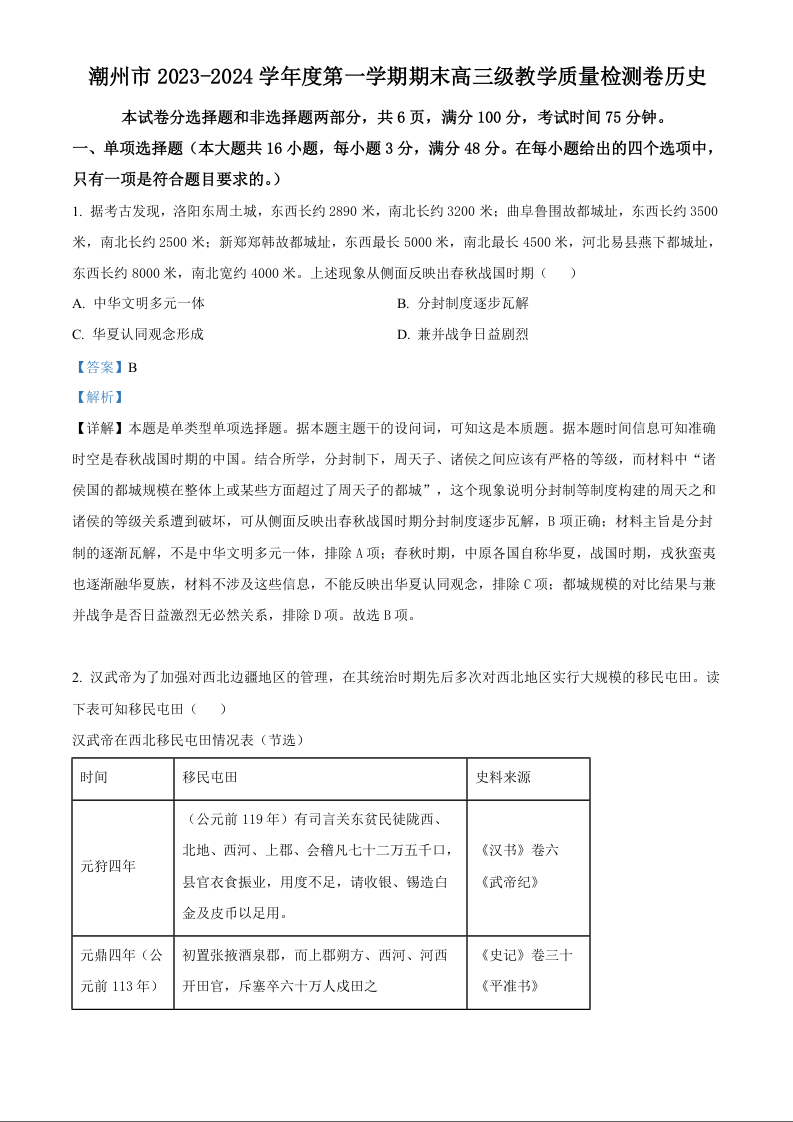 广东省潮州市2024届高三上学期期末考试历史(精品解析版)