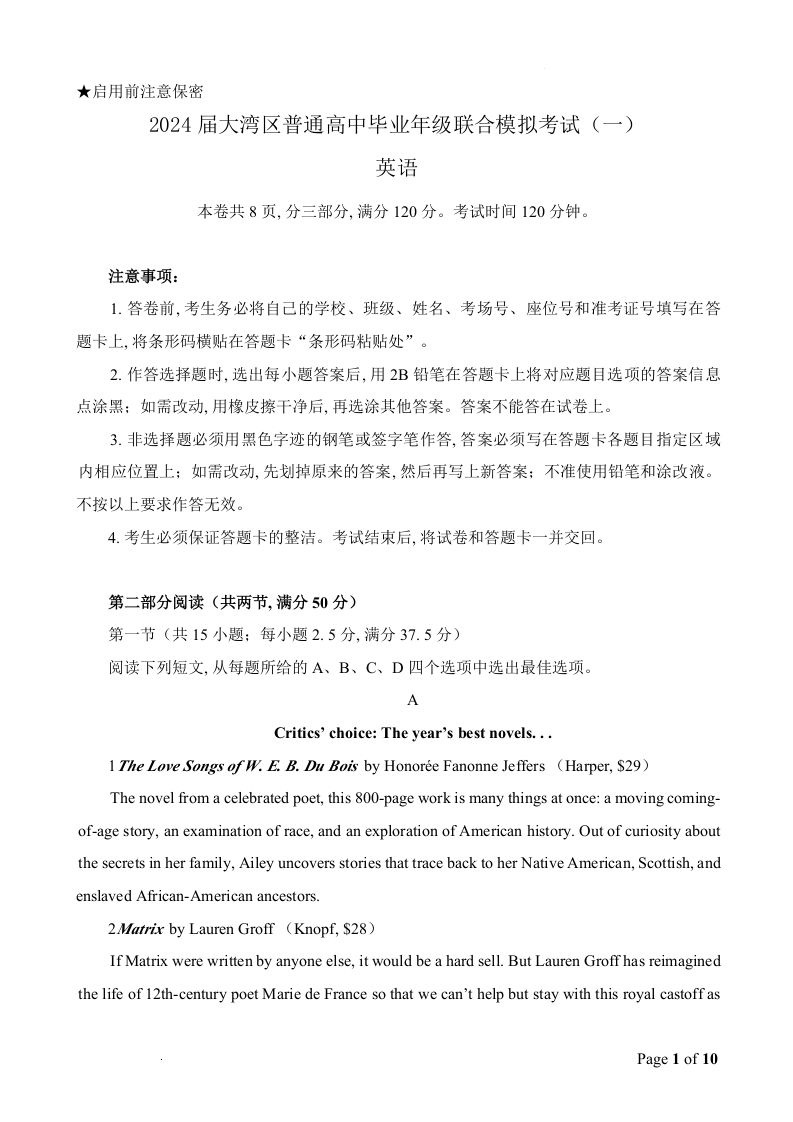 广东省大湾区2024届高三上学期联合模拟考试(一)英语