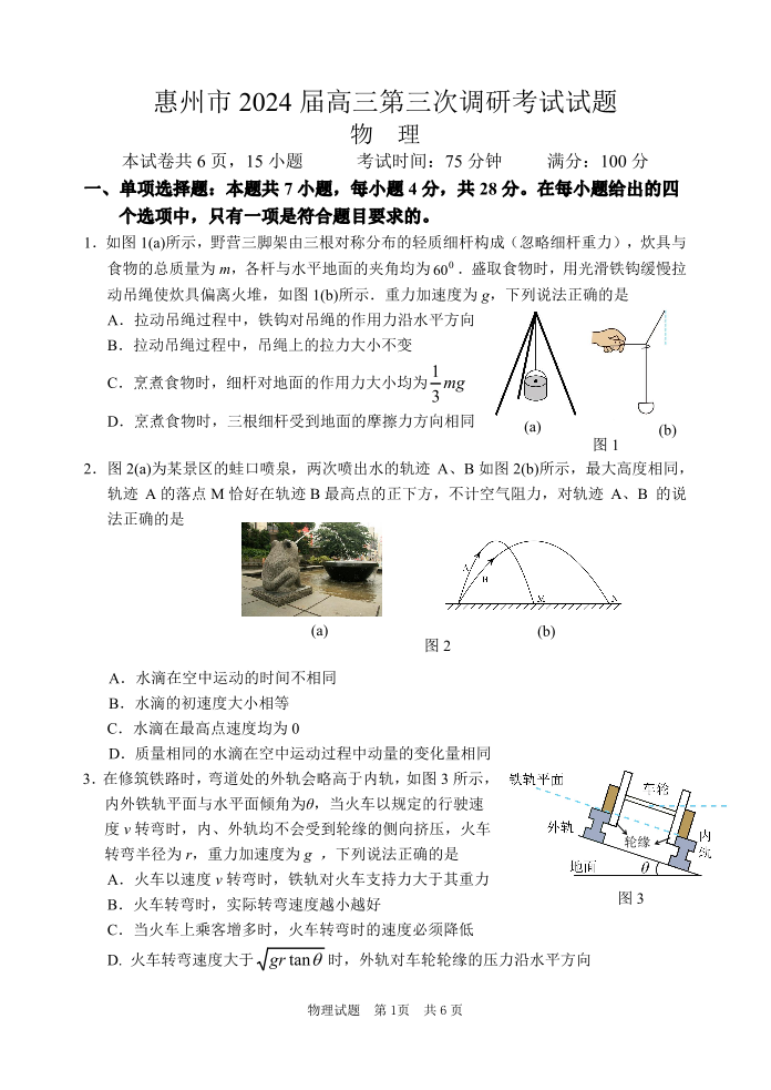 广东省惠州市2024届高三上学期第三次调研考试物理