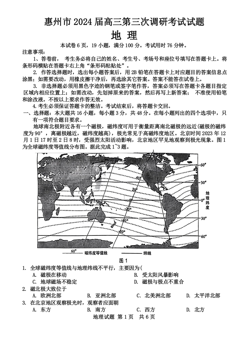 广东省惠州市2024届高三上学期第三次调研考试地理
