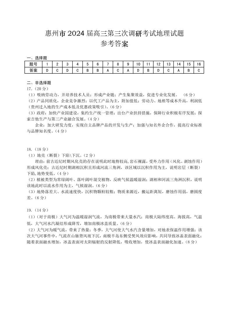 广东省惠州市2024届高三上学期第三次调研考试地理答案