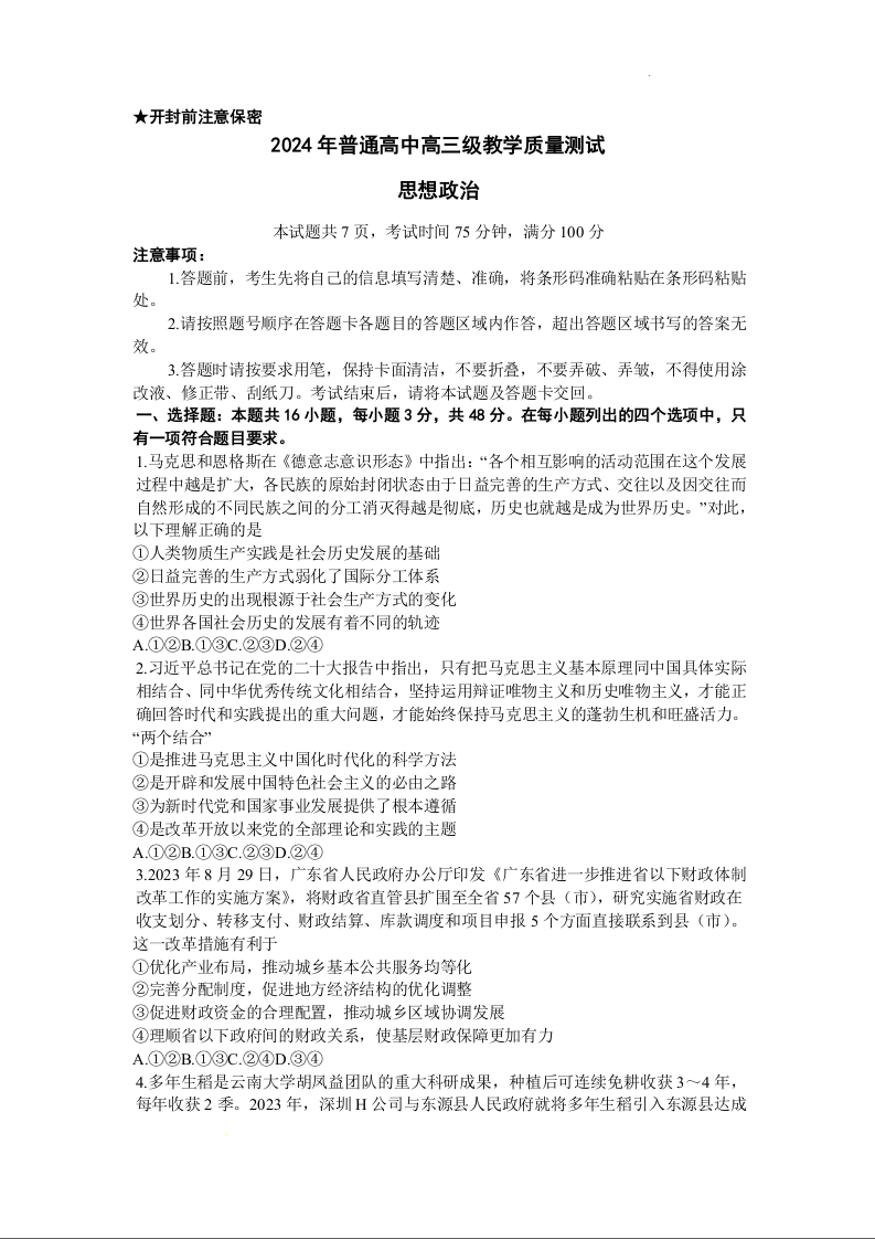 广东省揭阳市汕尾市2024届高三上学期1月期末考试政治