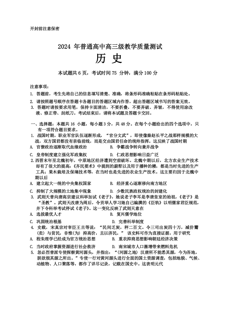 广东省揭阳市汕尾市2024届高三上学期1月期末考试历史