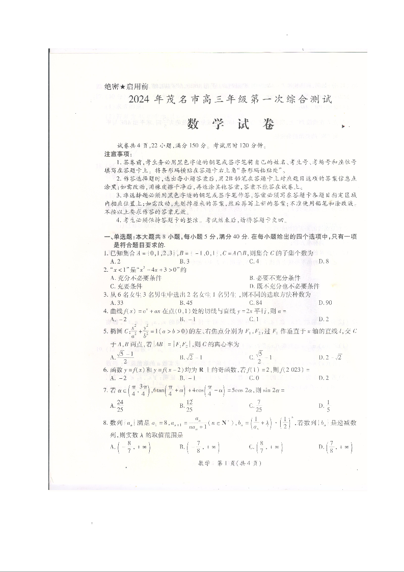 广东省茂名市2024届高三年级第一次综合测试(茂名一模)数学