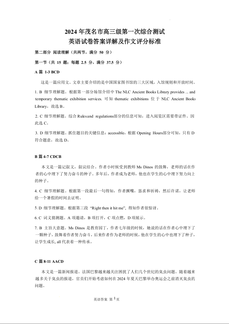 广东省茂名市2024届高三年级第一次综合测试(茂名一模)英语答案
