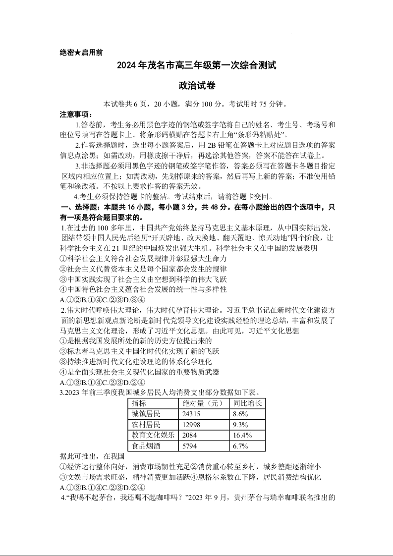 广东省茂名市2024届高三年级第一次综合测试(茂名一模)政治+答案
