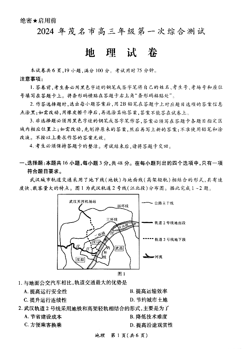 广东省茂名市2024届高三年级第一次综合测试(茂名一模)地理
