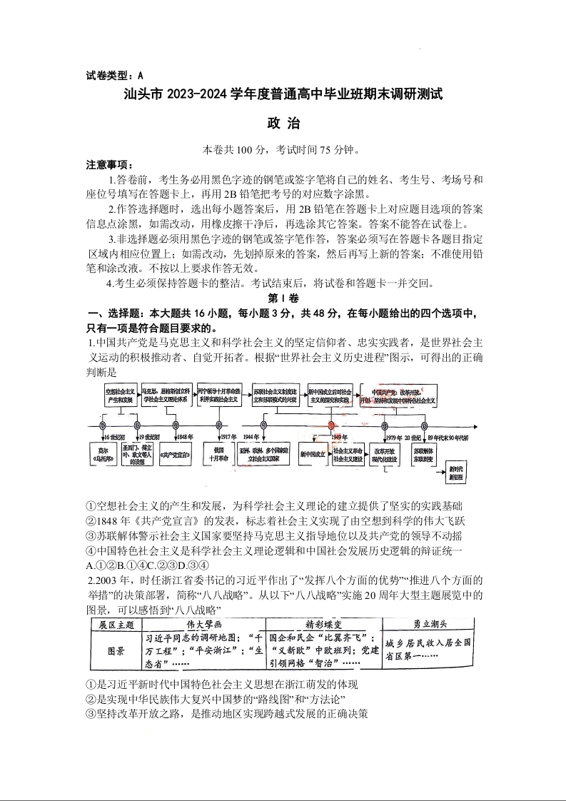 广东省汕头市2024届高三上学期期末考试政治+答案