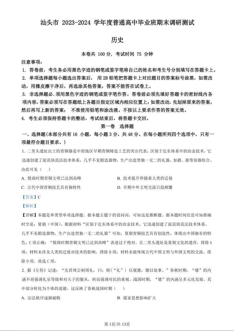 广东省汕头市2024届高三上学期期末考试历史(解析版)