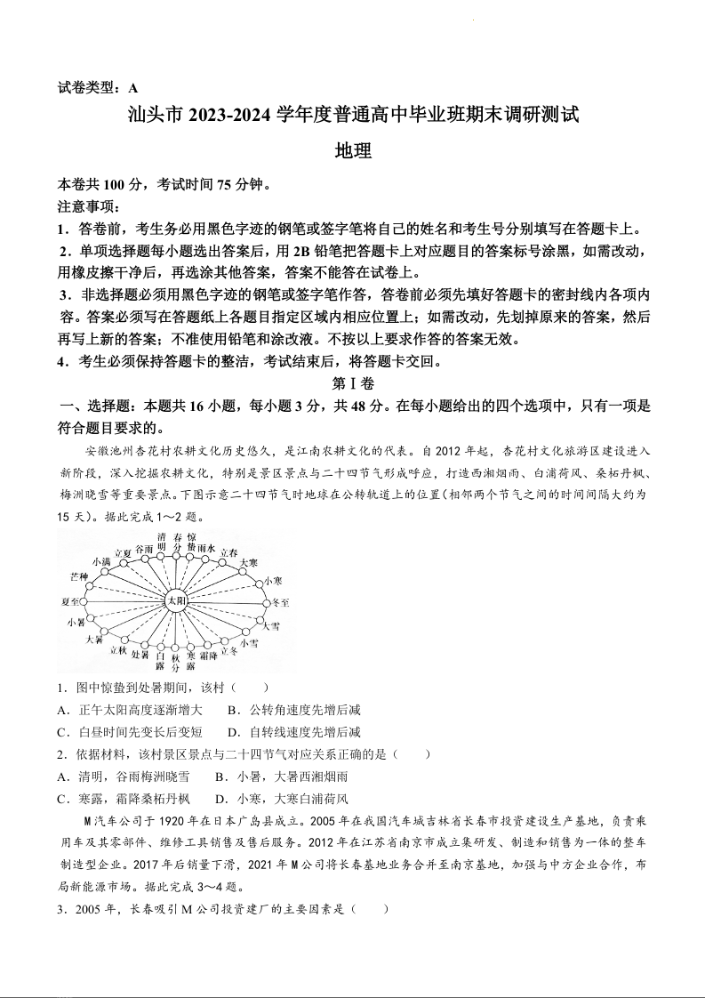 广东省汕头市2024届高三上学期期末考试地理