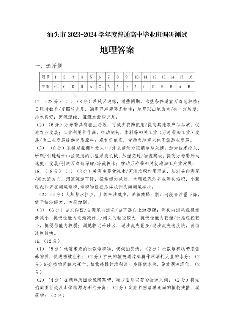 广东省汕头市2024届高三上学期期末考试地理答案