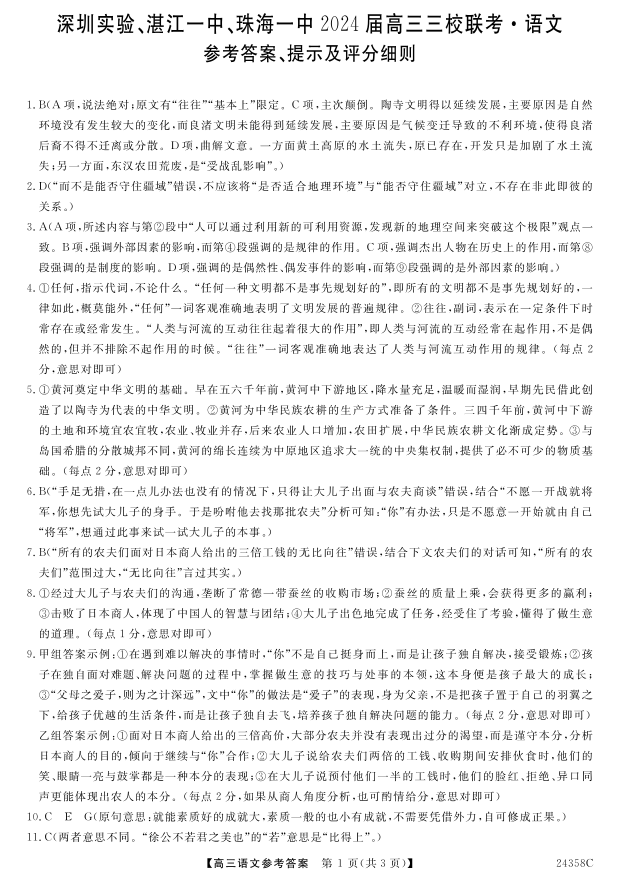 广东省深圳实验,湛江一中,珠海一中2024届高三上学期12月联考语文答案