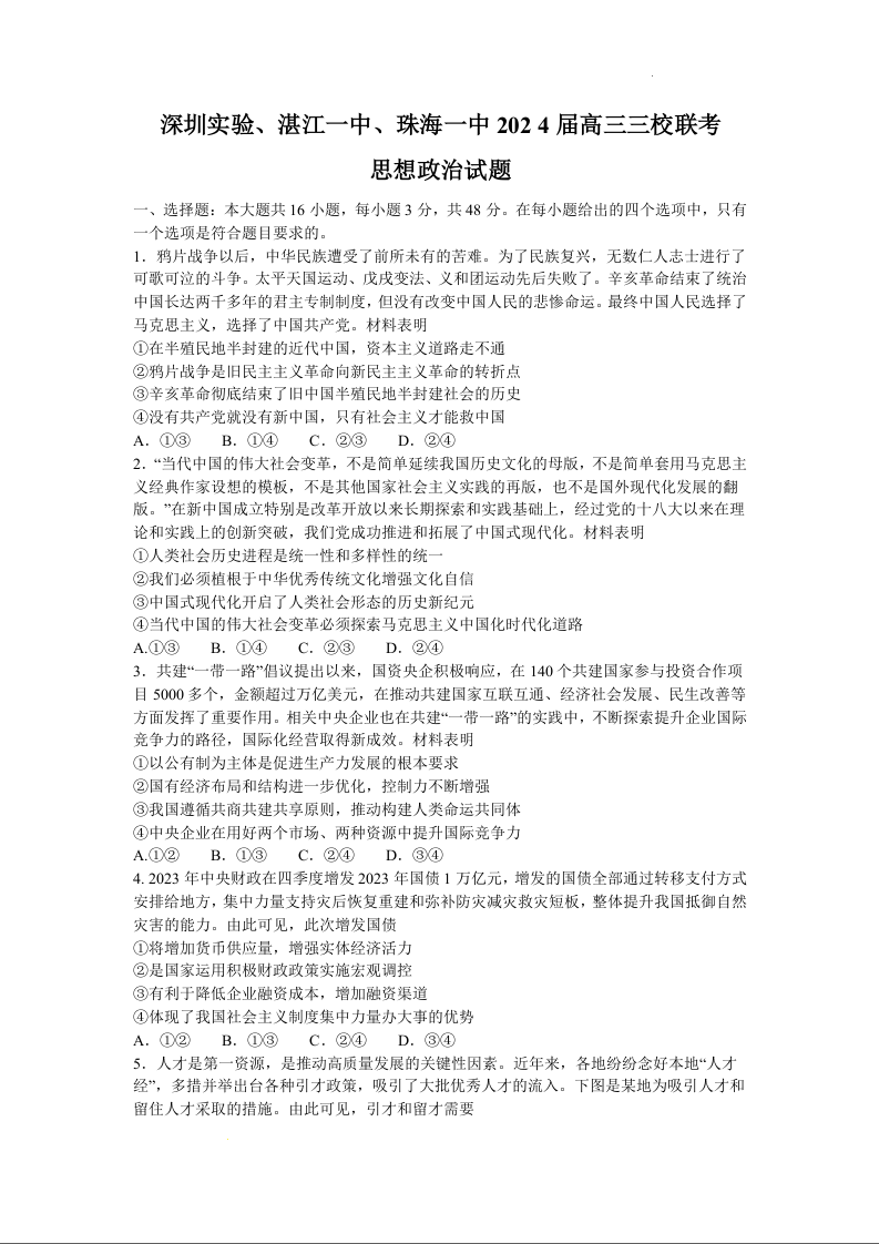 广东省深圳实验,湛江一中,珠海一中2024届高三上学期12月联考政治