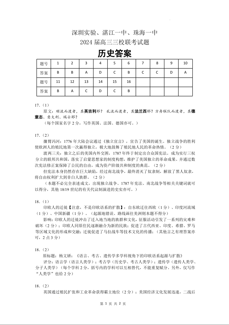 广东省深圳实验,湛江一中,珠海一中2024届高三上学期12月联考历史答案