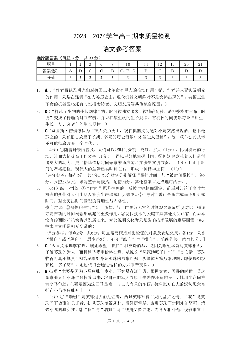 广东省深圳市罗湖区2024届高三上学期期末质量监测语文答案