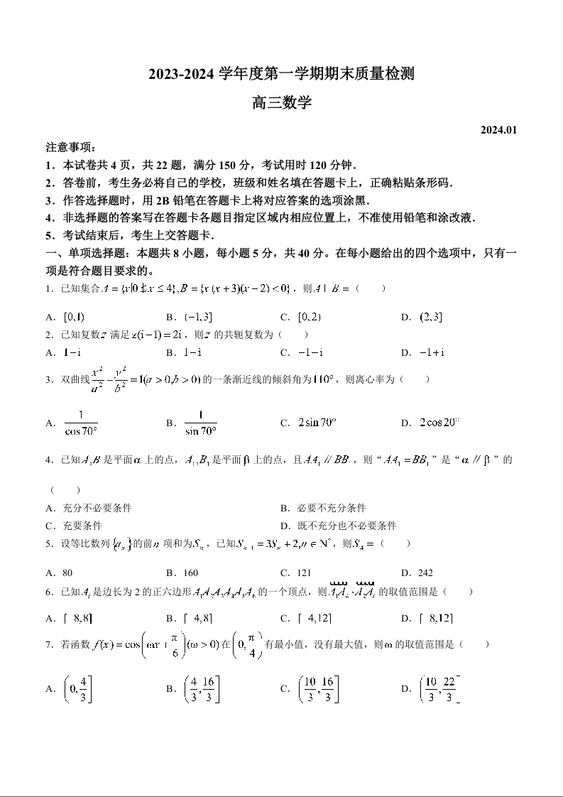 广东省深圳市罗湖区2024届高三上学期期末质量监测数学+答案